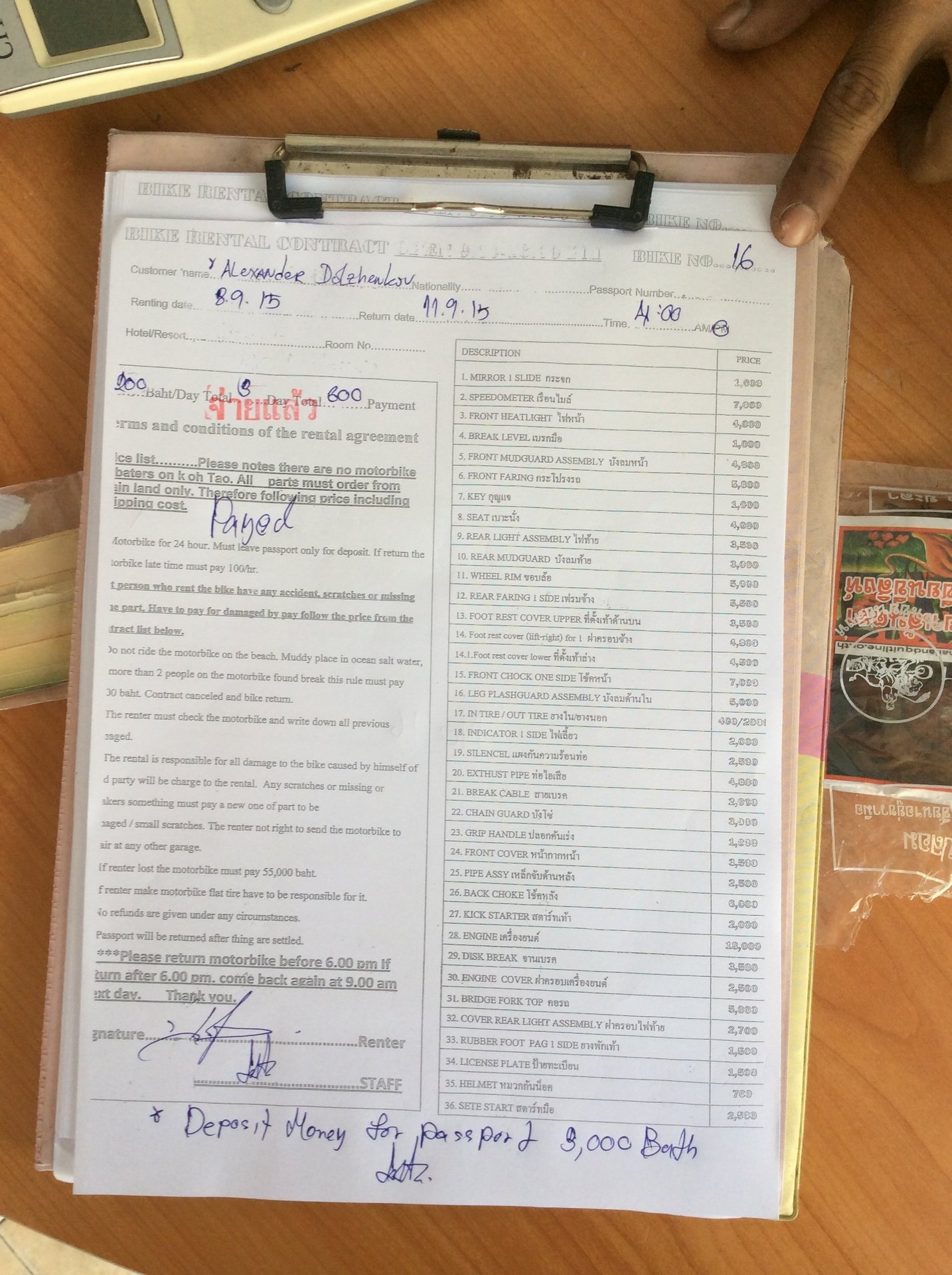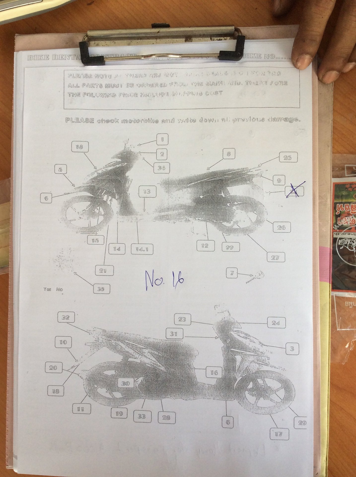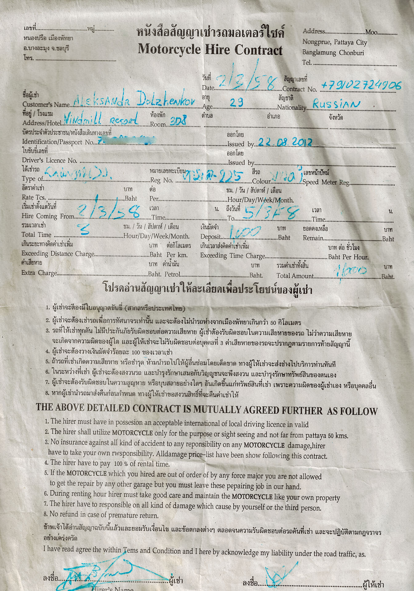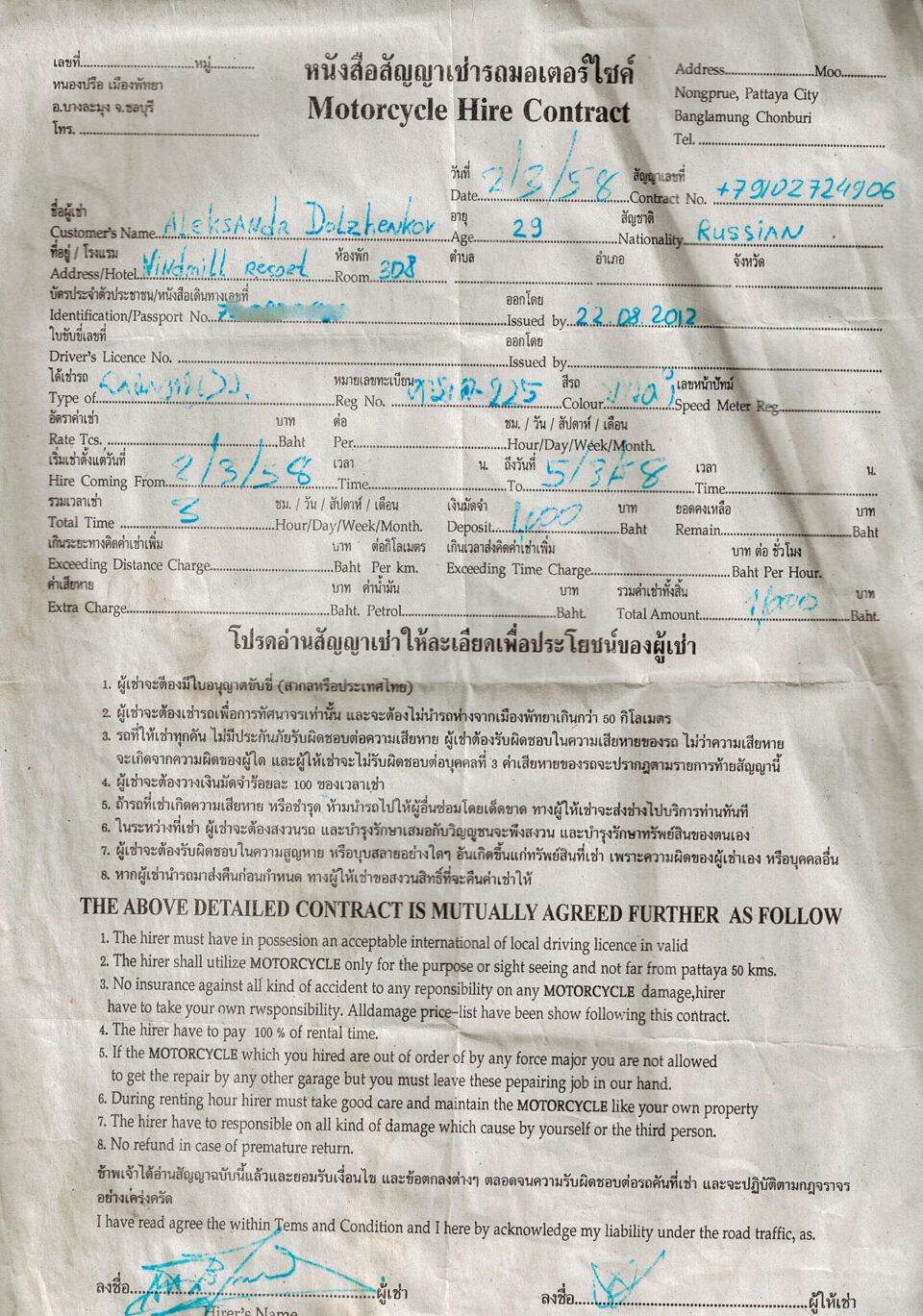Вот несколько арендных бланков, везде они разные. На некоторых бланках можно отметить где на арендуемом мотобайке есть царапины или какие-то повреждения, чтобы при возврате не возникло проблем. На некоторых нет и лучше сразу при аренде сфотографировать существующие царапины самому на свой фотоаппарат. Это также поможет избежать возможных претензий.