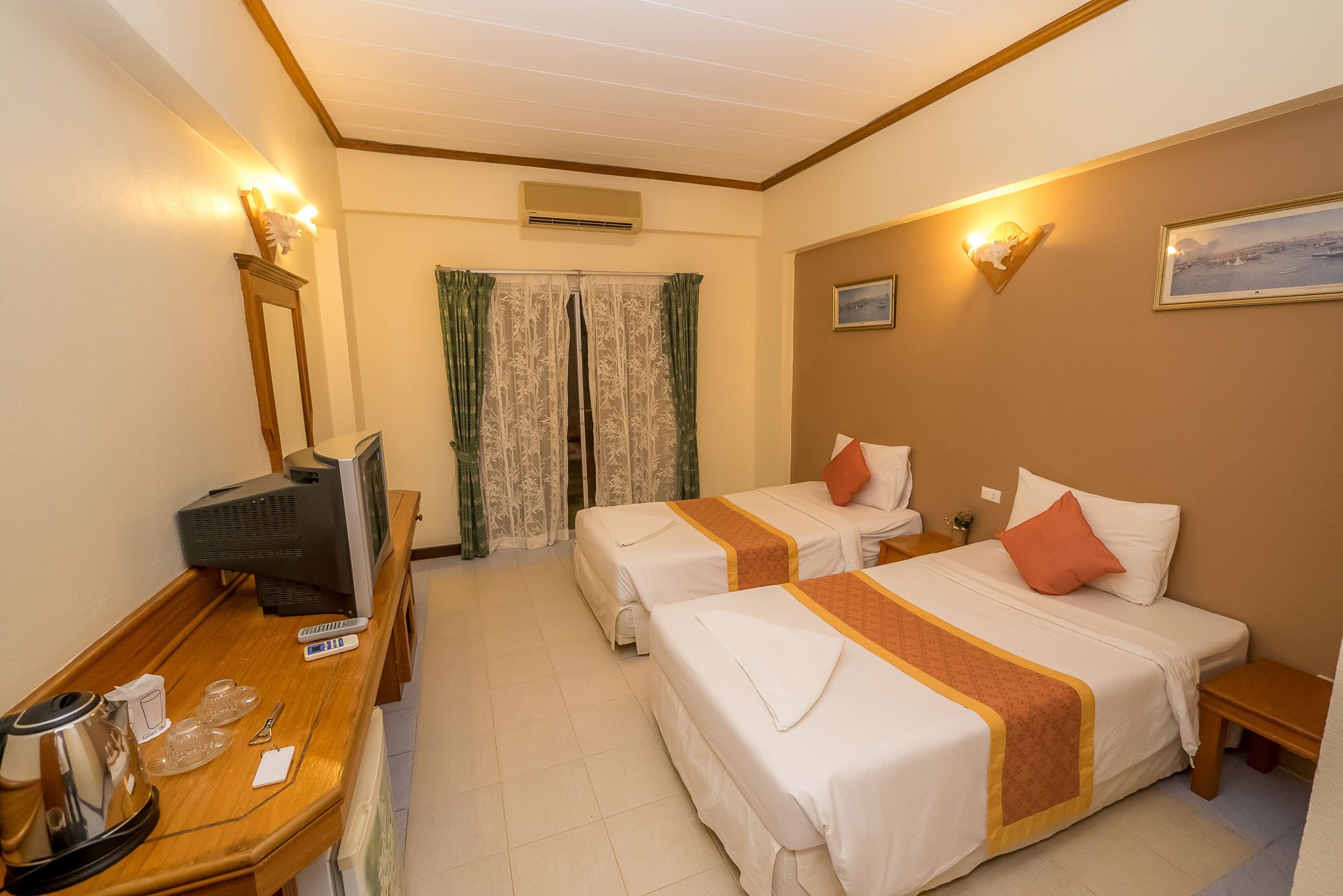 Есть кондиционер, чайные принадлежности, ТВ, холодильничек.