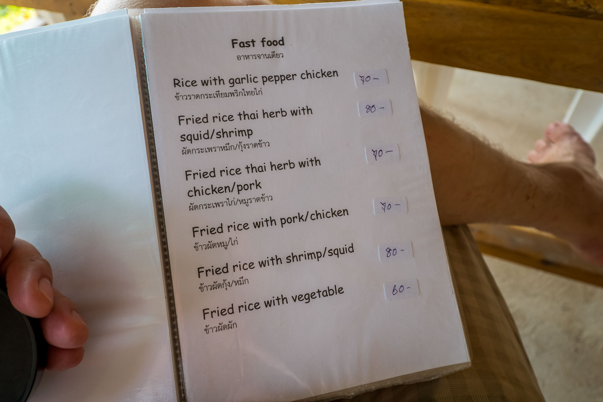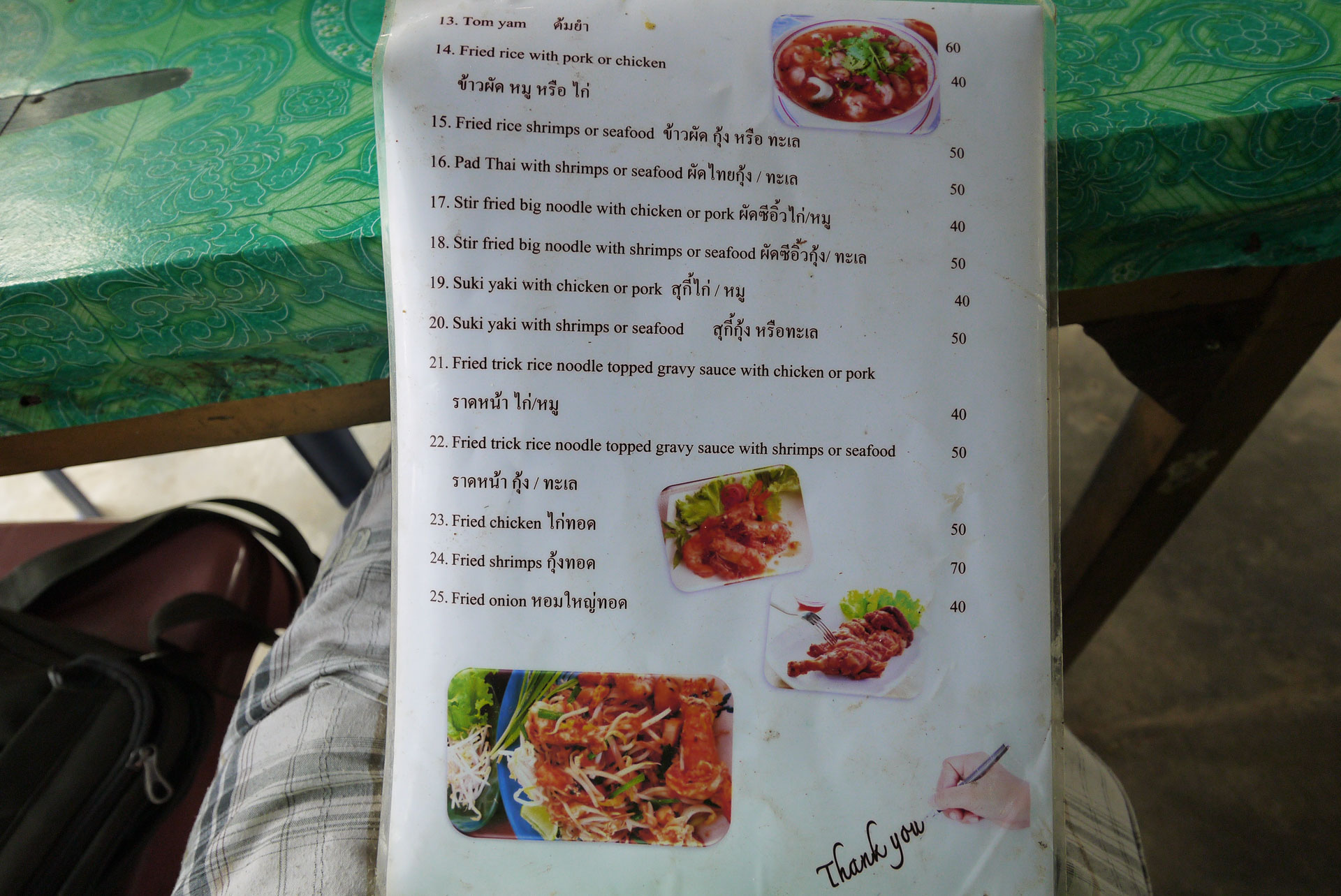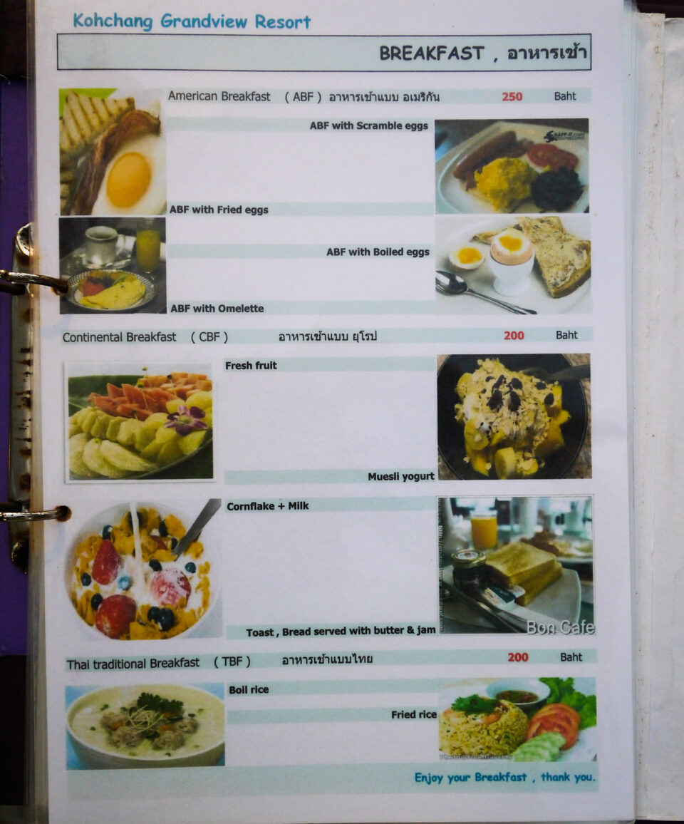 Буду собирать здесь периодически фотографии еды на Ко-Чанге. Дело в том что иногда в кафешках нет фото, а перевод с английского не всегда дает представление что это. И люди, особенно старшее поколение, теряются. Также интересуются порядком цен. А не дорого ли это? Может за углом дешевле? Давайте рассмотрим для примера: