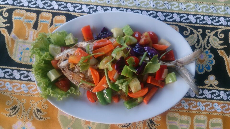 Жаренная рыба с овощами (Fried fish with vegetables) за 200 бат:
