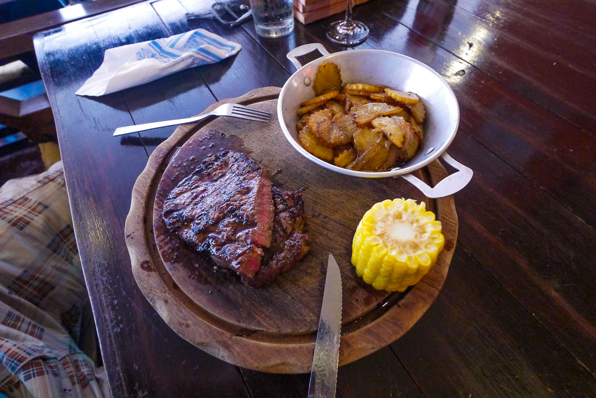 За говяжий стейк с картошкой и кукурузой плюс бокал вина просят ~700 бат.