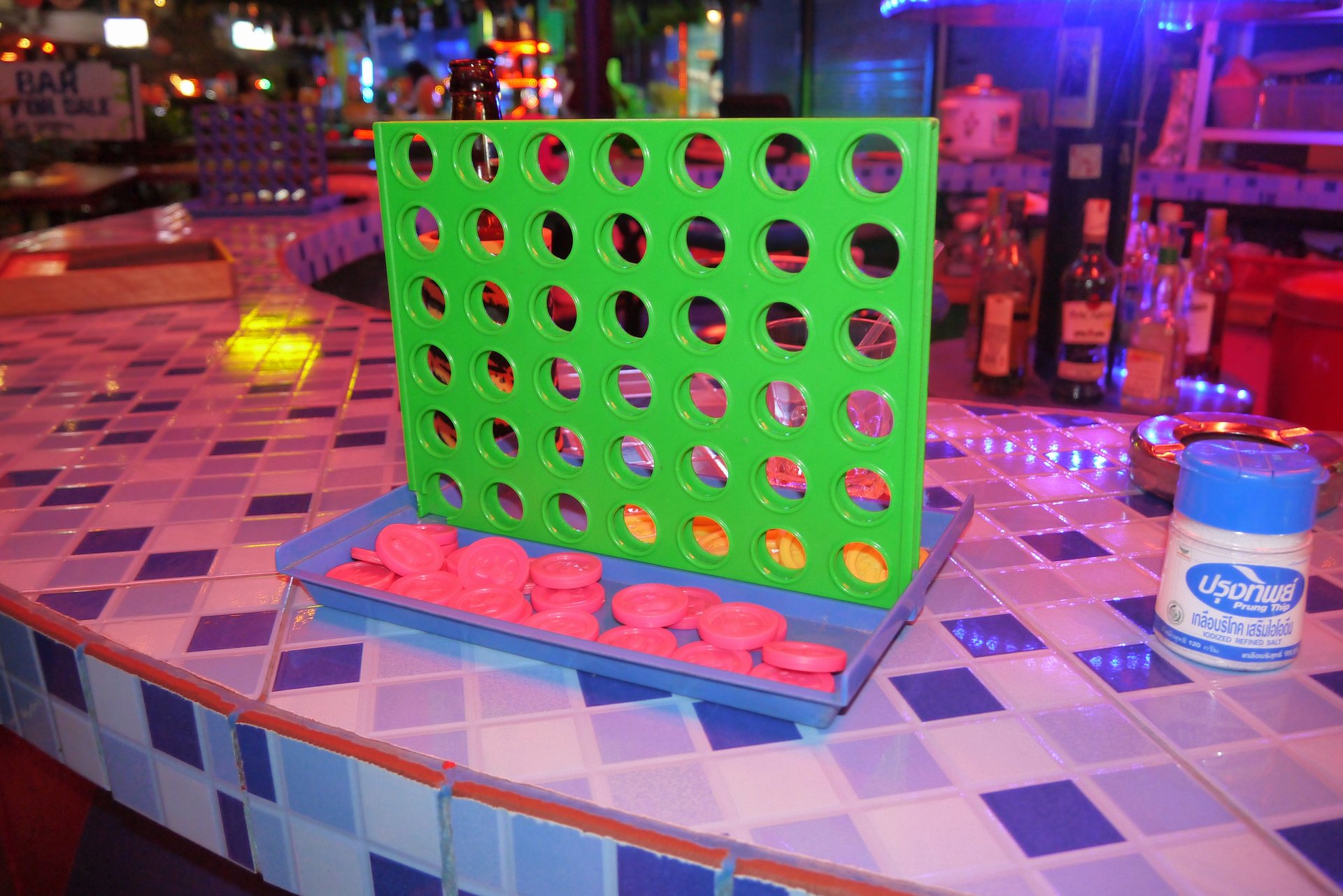 Помимо бильярда, который кстати есть не во всех барах, есть такая интересная игра Четыре в ряд (Connect four). Cмысл состоит в том что по очереди вы с соперником опускаете жетоны разных цветов. И цель игры выстроить линейку из 4 подряд стоящих жетонов вашего цвета (неважно вертикально или диагонально или горизонтально). При этом опуская свои жетоны вы должны не дать сопернику построить змейку раньше. Выигрывает тот кто сделает это первым. Эта игра хороший тест на трезвость)